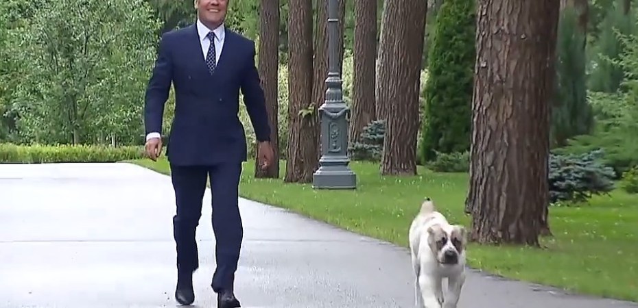 На видео четырехмесячный щенок по кличке Айк гуляет вместе с премьером по территории резиденции в Горках и бегает по одному из залов заседаний.