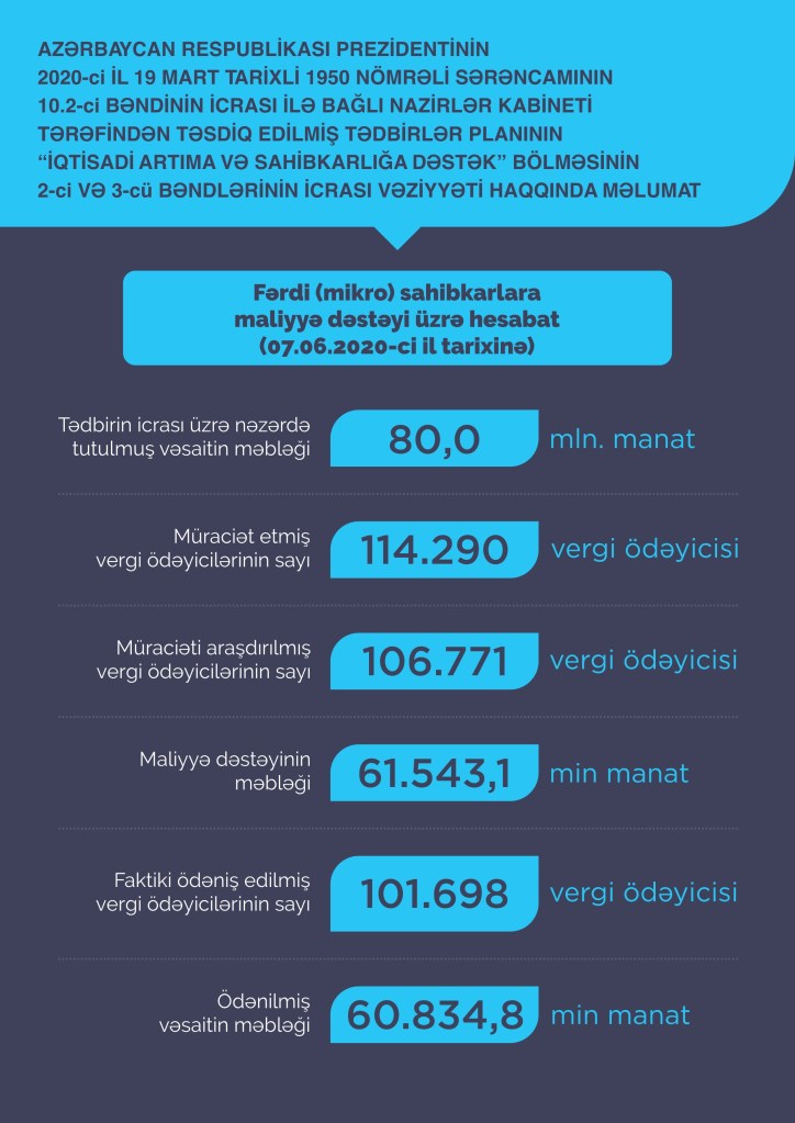 В рамках программы по оказанию финансовой поддержки частным (микро) предпринимателям поступили 114 290 обращений, 106 771 из которых утверждены и представлены минфину для перечисления выделенных финансовых средств на банковские счета налогоплательщиков. Объем финансовой помощи по утвержденным обращениям составляет 61,54 миллиона манатов. На 7 июня Государственное казначейское агентство Министерства финансов обеспечило перечисление средств в размере 60,83 миллиона манатов 101 698 частным (микро) предпринимателям.