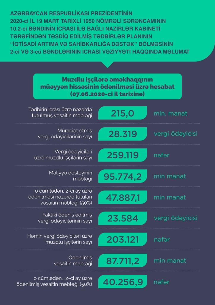 Обращения, поступившие от 24 169 предпринимателей по выдаче части заработной платы 208 799 наемных работников, рассмотрены, утверждены и переданы в министерство финансов для перечисления назначенных финансовых средств на их банковские счета. Обращения других налогоплательщиков находятся на стадии рассмотрения. Объем финансовой поддержки по утвержденным на сегодня обращениям составляет 95,77 миллиона манатов, в том числе объем средств, которые предусматривается выплатить на первом этапе, составляет 47,88 миллиона манатов. На 7 июня Государственное казначейское агентство министерства финансов обеспечило перечисление средств в размере 69,12 миллиона манатов 23 584 налогоплательщикам по зарплатам 203 121 наемного работника.