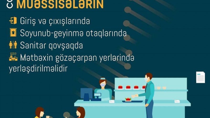 – Bu cür məkanlarda mütəmadi dezinfeksiya işləri aparılmalı, hər bir masada dezinfeksiyaedici məhlulların yerləşdirilməsi təmin olunmalıdır. Qida qəbulu zallarında, otaqlarda və açıq məkanlarda sərinkeşlərdən (ventilyatorlardan) istifadə olunmamalı, təmizlik-dezinfeksiya işləri iş saatı ərzində əsasən işlək sahələrdə (giriş-çıxış, kassa və s.), iş saatından sonra isə bütün sahələrdə həyata keçirilməlidir.