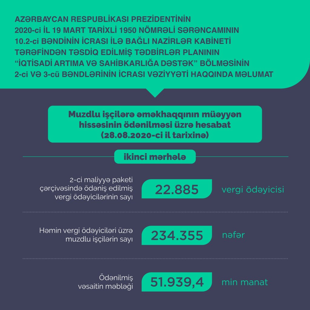 Avqust ayında yeni maliyyə dəstəyi çərcivəsində 234.355 muzdlu işçini əhatə edən 22.885 vergi ödəyicisinə 51.939,4 min manat vəsait ödənilib. Maliyyə dəstəyi proqramının ikinci mərhələsində ödənişlə əhatə olunmuş muzdlu işçilərin sayı birinci mərhələdə vəsait almış muzdlu işçilərin sayından 18.245 nəfər çoxdur ki, bu da şəffaflaşdırma nəticəsində əmək müqavilələri bağlamış işçi saylarının artması ilə əlaqədardır. İkinci maliyyə dəstəyi çərcivəsində avqust ayında 49.887 fərdi (mikro) sahibkara 12.471,8 min manat birdəfəlik maliyyə dəstəyi göstərilib.