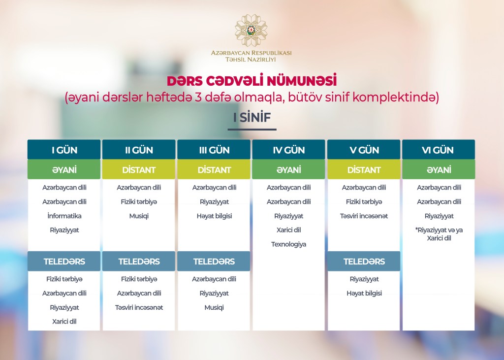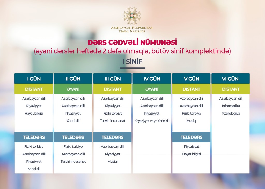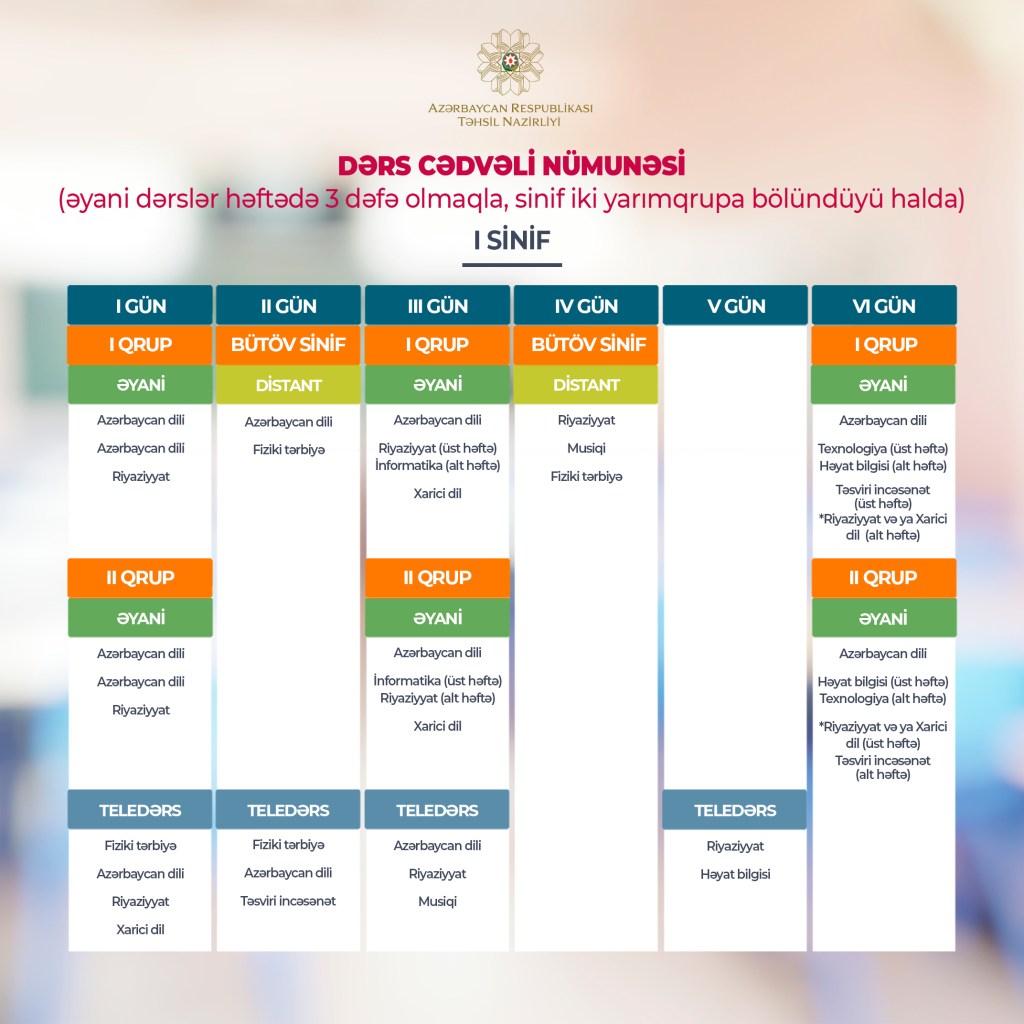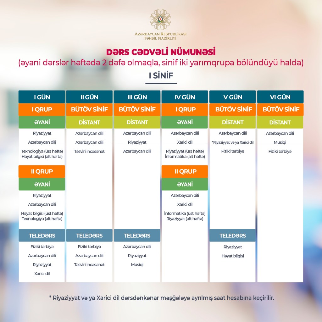 “Hörmətli məktəb rəhbərləri və müəllimlər, Hibrid tədris üçün dərs cədvəli nümunəsini təqdim edirik. Bu nümunələr 4 müxtəlif situasiyanı əhatə edir: əyani tədris həftədə 2 dəfə olarsa və sinifdə şagird sayı sosial məsafəni qorumağa imkan verərsə, başqa sözlə, bütöv sinif üçün; əyani tədris həftədə 2 dəfə olarsa və sinifdə şagird sayı sosial məsafəni qorumağa imkan verməzsə, başqa sözlə, sinif qruplara bölünərsə; əyani tədris həftədə 3 dəfə olarsa və sinifdə şagird sayı sosial məsafəni qorumağa imkan verərsə, başqa sözlə, bütöv sinif üçün; əyani tədris həftədə 3 dəfə olarsa və sinifdə şagird sayı sosial məsafəni qorumağa imkan verməzsə, başqa sözlə, sinif qruplara bölünərsə. Bu nümunədən istifadə etməklə sizin məktəbin xüsusiyyətlərinə uyğun dərs cədvəli hazırlaya bilərsiniz”, – deyə müraciətdə qeyd edilib.