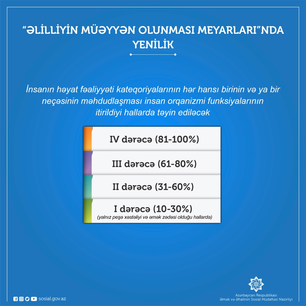 Əlilliyin qiymətləndirilməsi üzrə yeni meyarlara əsasən, insanın həyat fəaliyyəti kateqoriyalarının hər hansı birinin və ya bir neçəsinin məhdudlaşması insan orqanizmi funksiyalarının IV dərəcə (81-100%), III dərəcə (61-80%) və II dərəcə (31-60%) itirildiyi hallarda təyin ediləcək. İnsan orqanizmi funksiyalarının I dərəcə itirilməsi zamanı (10-30%) yalnız peşə xəstəliyi və əmək zədəsi olduğu hallarda qiymətləndirilmə aparılacaq. 18 yaşınadək uşaqlara sağlamlıq imkanlarının məhdudluğu insanın həyat fəaliyyətinin istənilən kateqoriyasının və istənilən məhdudlaşmasının (əmək fəaliyyəti ilə məşğul olmaq bacarığı istisna olmaqla) hər üç məhdudlaşma dərəcəsi mövcud olduğu və uşağın sosial müdafiəsi zərurətindən irəli gələn halda müəyyən ediləcək.