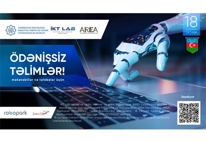 TIME rəsmi mənbəyə istinadən bildirir ki, Nəqliyyat, Rabitə və Yüksək Texnologiyalar Nazirliyinin İKT LAB Tətbiq və Tədris Mərkəzinin dəstəyi və AREA Akademiyasının təşkilatçılığı ilə Şanlı Ordumuzun zəfərlərini tərənnüm etmək məqsədilə məktəbli və tələbələr üçün “AREA Mən Pilotam”, “AREA Helikopter Mühəndisliyi”, “AREA Robotexnika” təlimləri keçiriləcək.