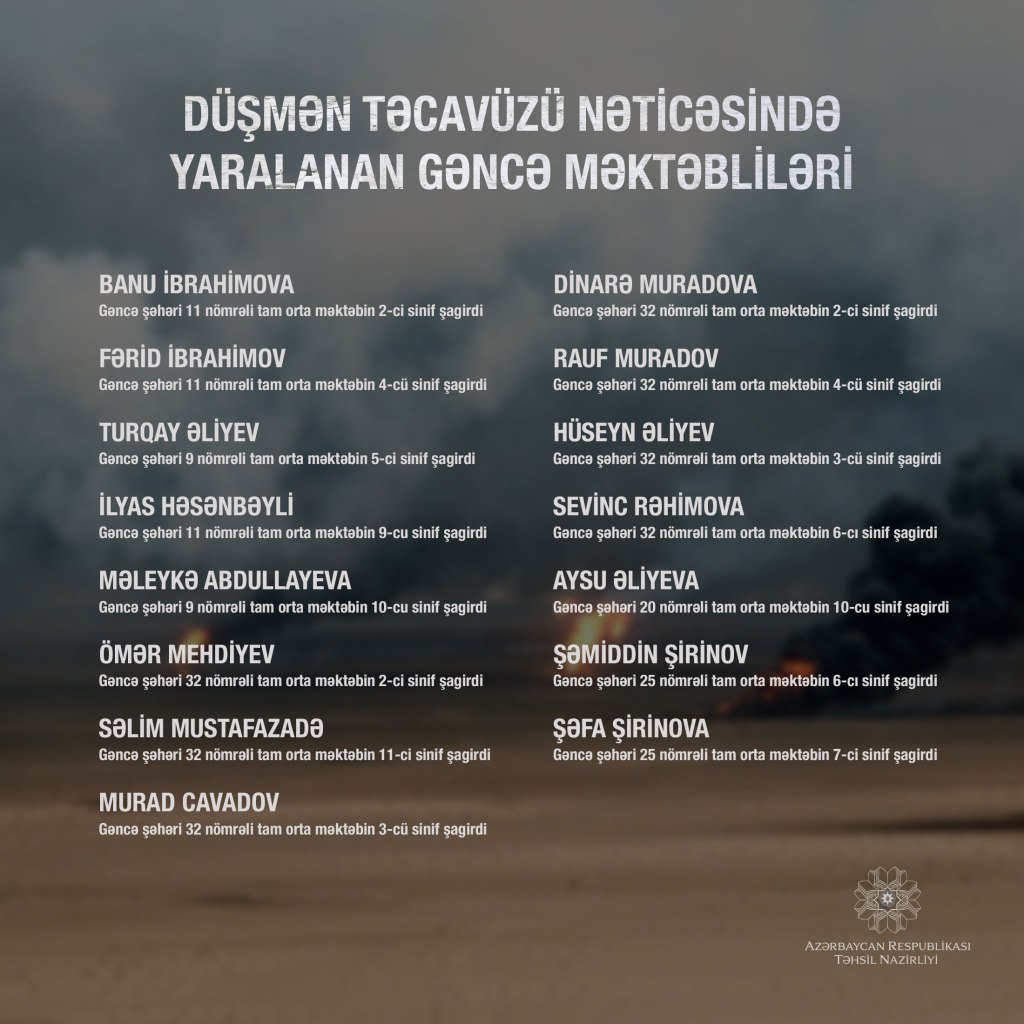 Yaralananlardan 10 nəfəri məktəblidir. Ömər Mehdiyev Gəncə şəhəri 32 nömrəli tam orta məktəbin 2-ci, Səlim Mustafazadə həmin məktəbin 11-ci, Murad Cavadov 3-cü, Dinarə Muradova 2-ci, Rauf Muradov 4-cü, Hüseyn Əliyev 3-cü, Sevinc Rəhimova 6-cı sinif şagirdləridir.
