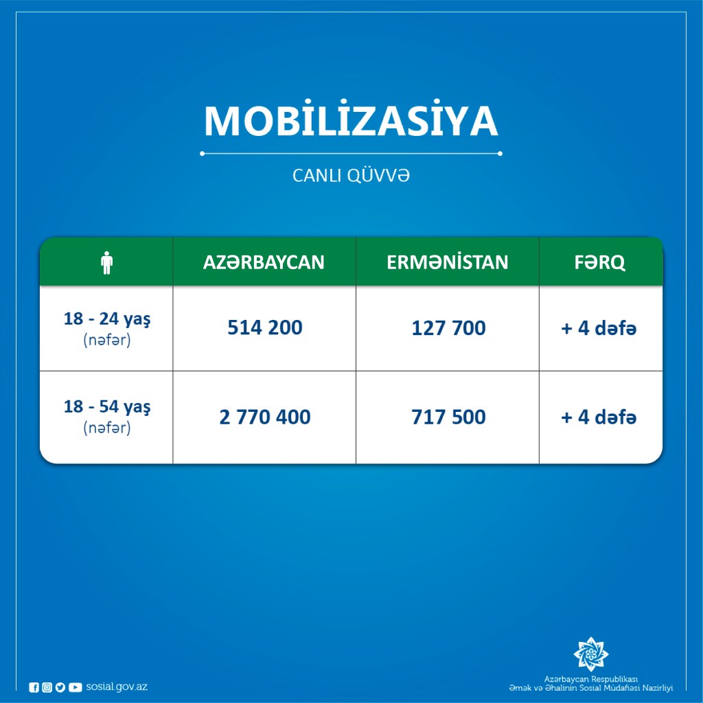 Azərbaycan Silahlı Qüvvələrinin canlı qüvvə baxımından mobilizasiya imkanlarına görə də bu gün Ermənistandan qat-qat üstündür. Belə ki, 18-24, həmçinin 18-54 yaş qrupu üzrə ölkəmizin mobilizasiya imkanı Ermənistandan 4 dəfədən də çoxdur.
