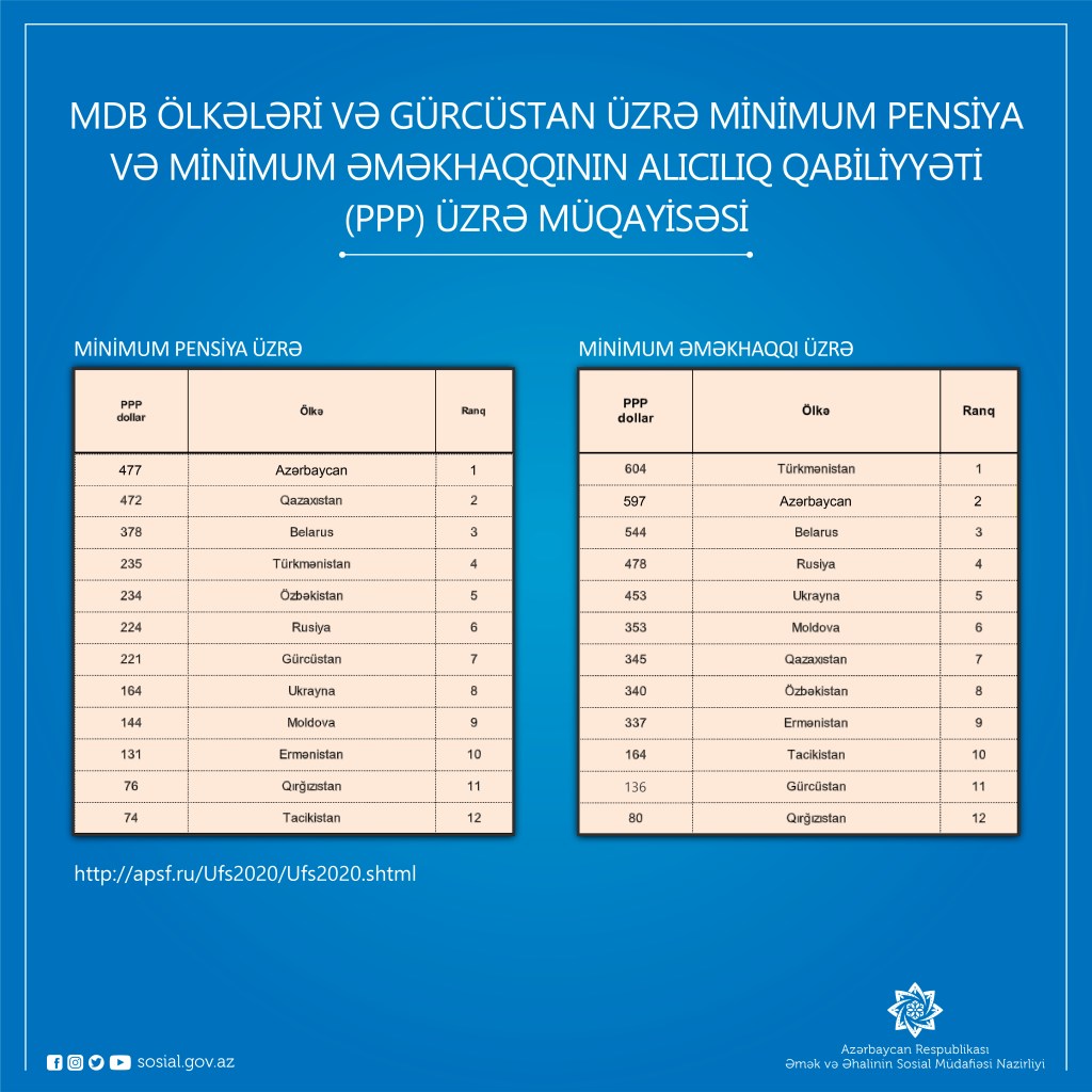 Belə ki, Azərbaycan minimum pensiyanın alıcılıq qabiliyyəti indeksi (PPP) üzrə MDB ölkələri və Gürcüstan üzrə sıralamada 1-ci yerdə, minimum əməkhaqqının alıcılıq qabiliyyəti indeksinə görə 2-ci yerdədir. Ermənistan isə bu sıralamalar üzrə son yerləri – müvafiq olaraq 10-cü və 9-cu yerləri tutur. Ümumilikdə Azərbaycanda minimum pensiya Ermənistanla müqayisədə 2 dəfə yüksəkdir.
