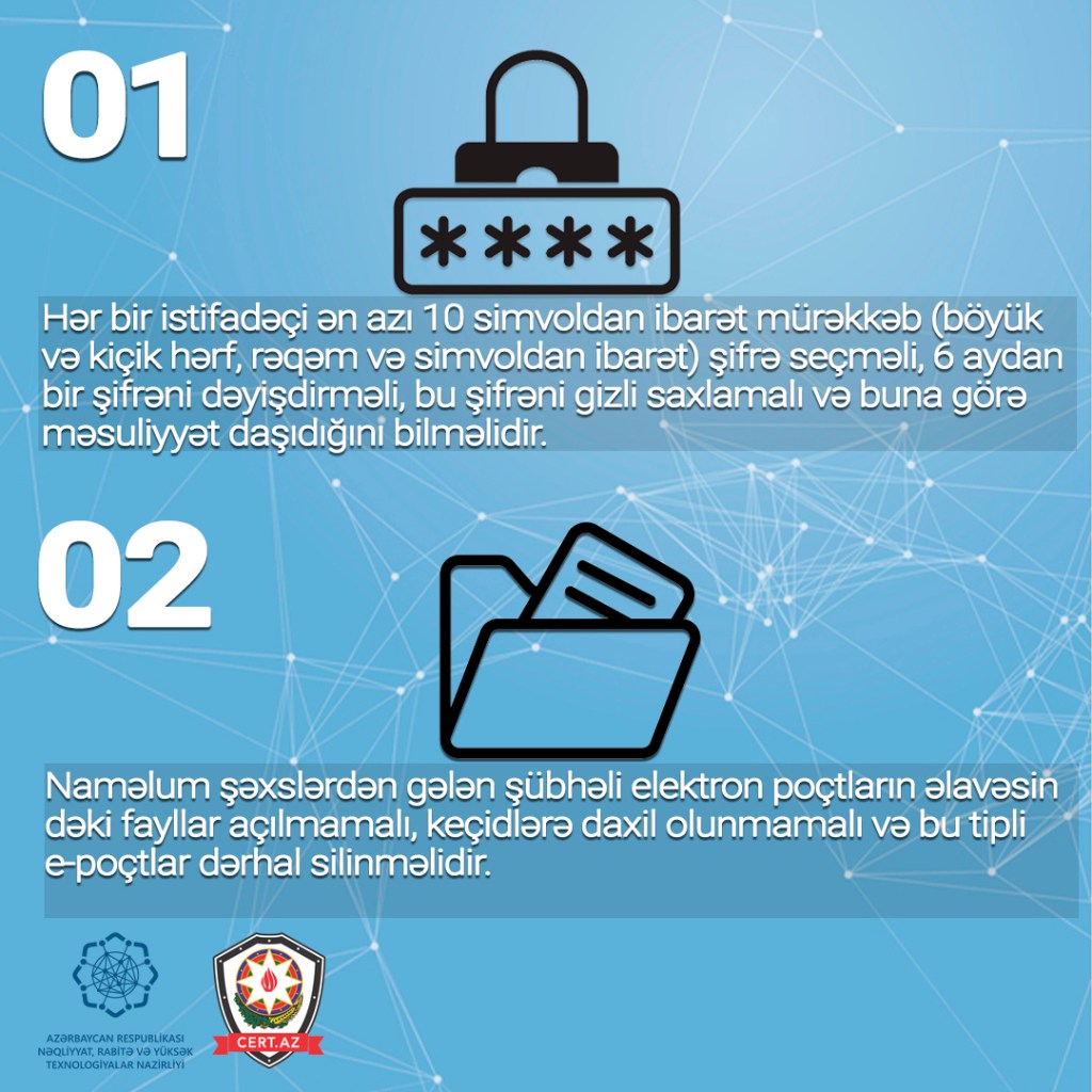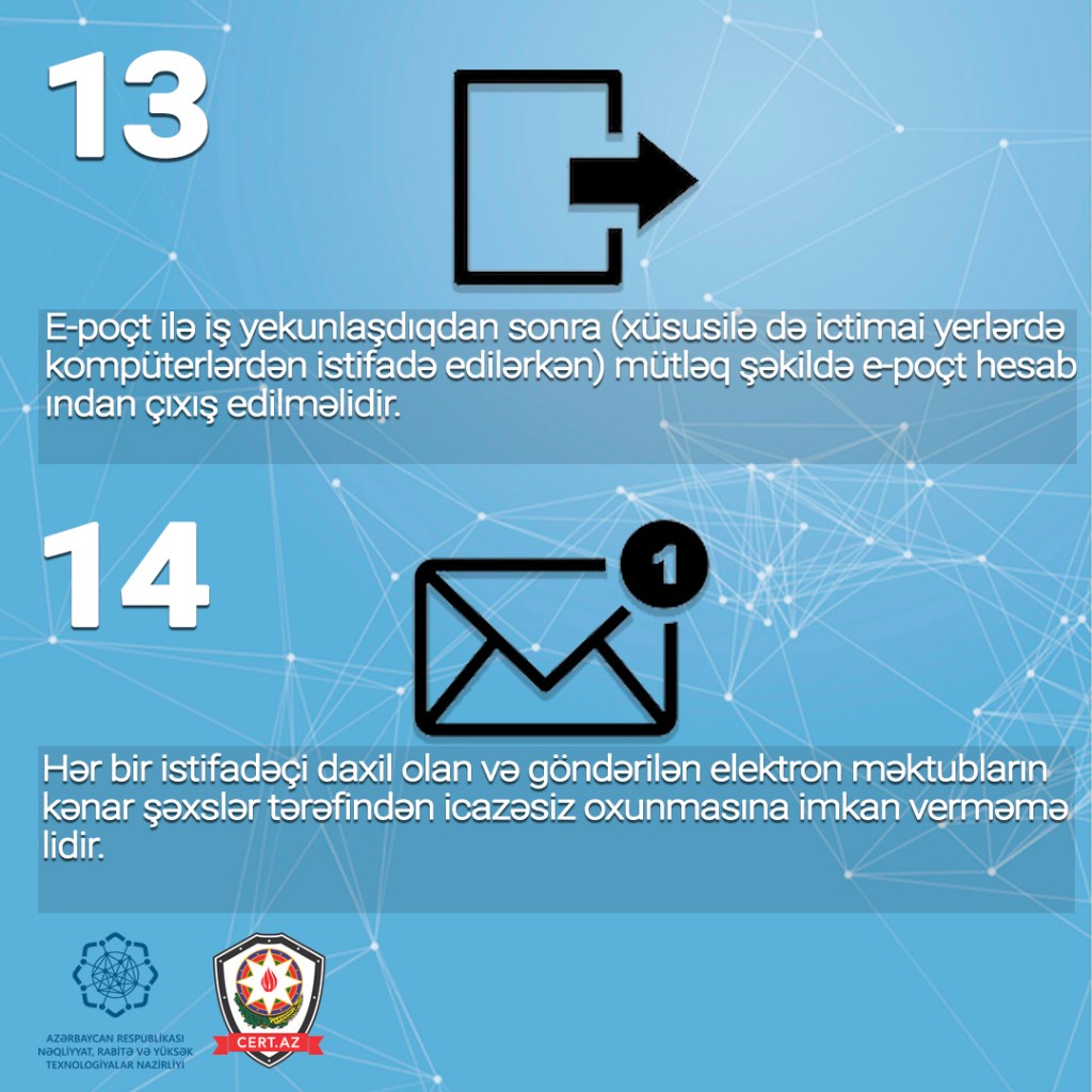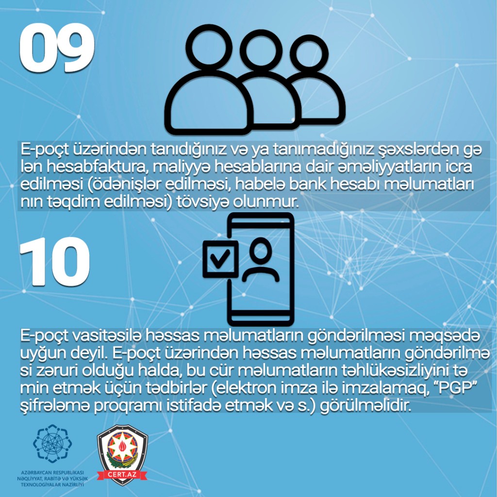 Odur ki, e-poçtdan təhlükəsiz istifadənin təmin olunması üçün aşağıdakı təhlükəsizlik qaydalarına riayət olunması tövsiyə edilir.