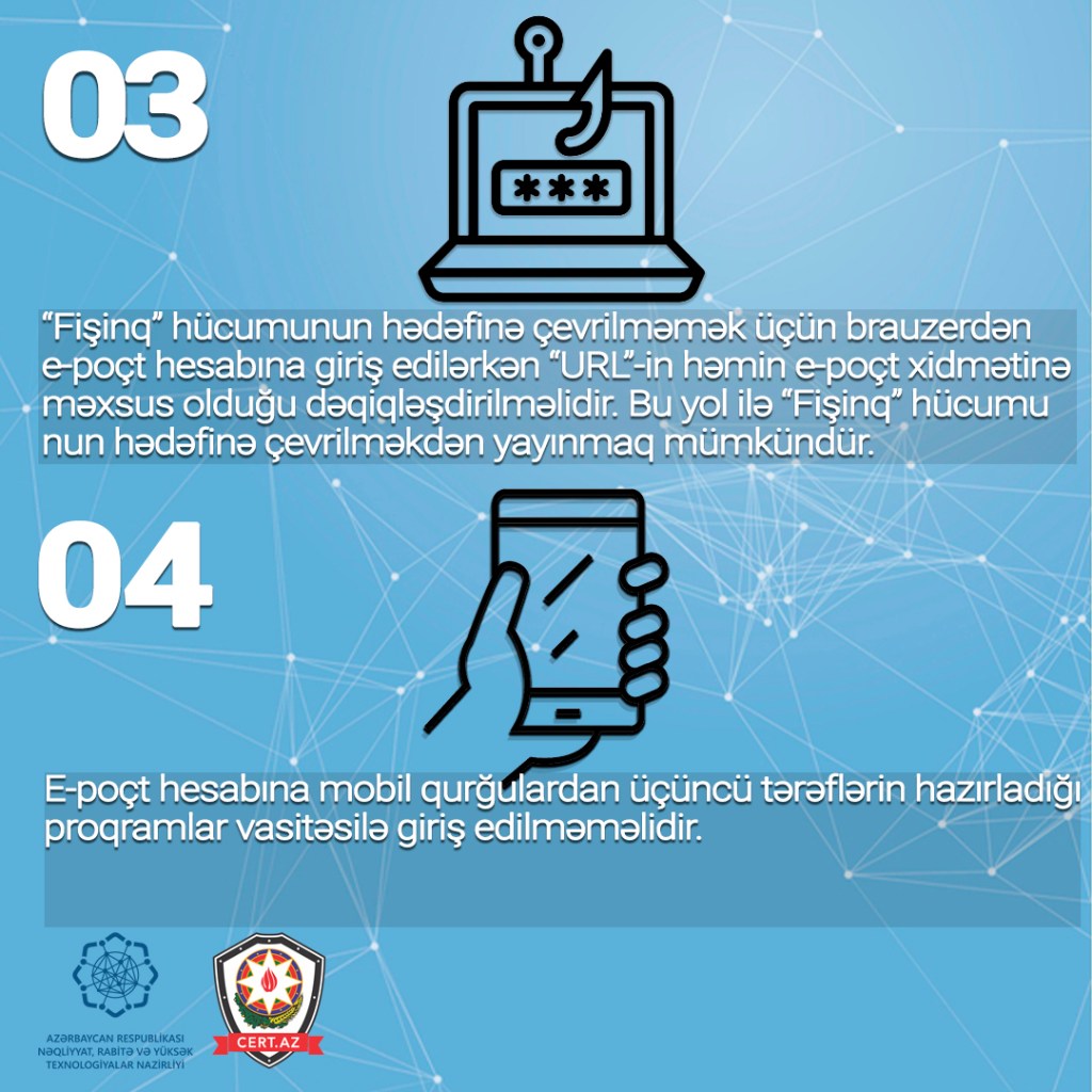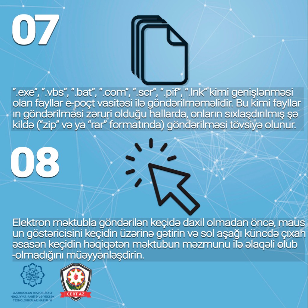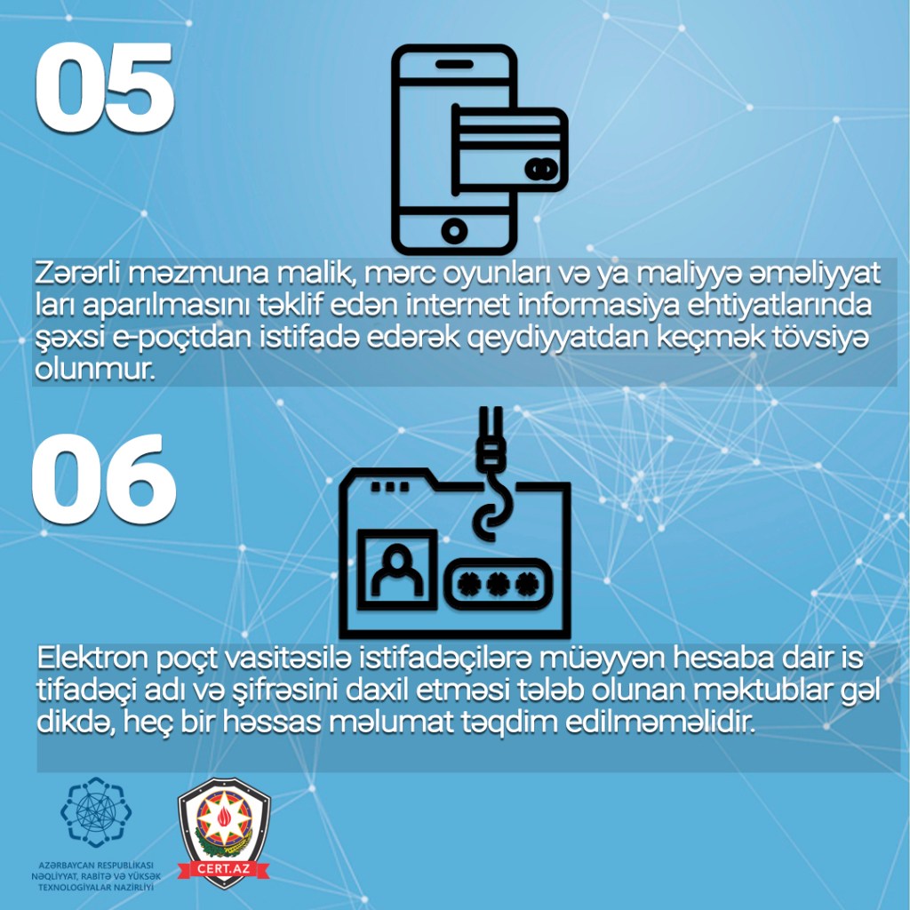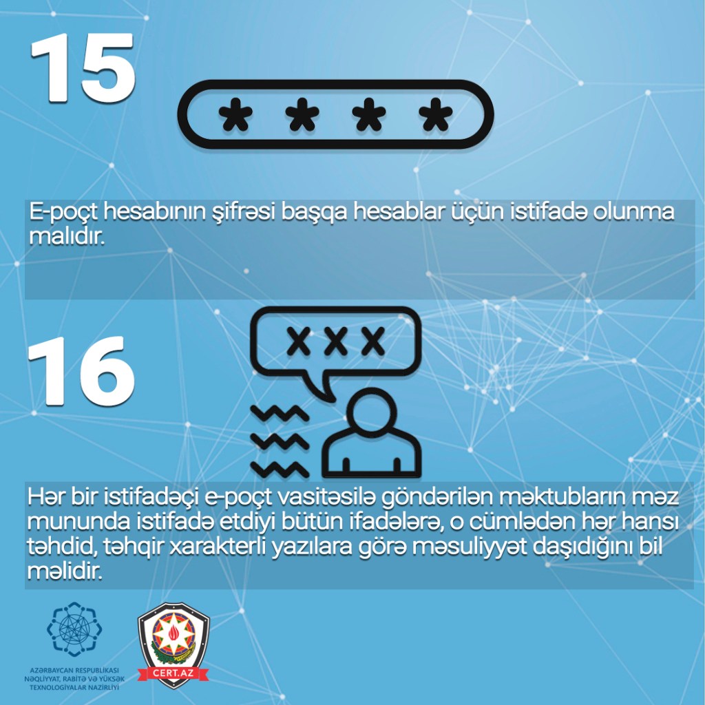 Odur ki, e-poçtdan təhlükəsiz istifadənin təmin olunması üçün aşağıdakı təhlükəsizlik qaydalarına riayət olunması tövsiyə edilir.