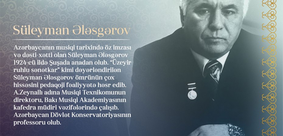 Təhsil Nazirliyinin “Qarabağın məşhur müəllimləri” layihəsinin növbəti siması görkəmli bəstəkar, pedaqoq, respublikanın xalq artisti Süleyman Ələsgərovdur. Süleyman Ələsgərov 1924-cü ildə musiqi və mədəniyyət beşiyi olan Şuşada anadan olub.