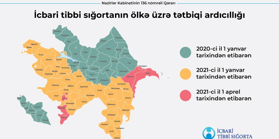 Beləliklə, ölkənin daha 36 şəhər və rayonu – Gəncə, Naftalan, Şirvan, Qazax, Ağstafa, Tovuz, Şəmkir, Gədəbəy, Daşkəsən, Samux, Göygöl, Goranboy, Xocalı, Beyləqan, Xocavənd, Ağcabədi, Laçın, Bərdə, Füzuli, Ağdam, Tərtər, Kəlbəcər, Astara, Lənkəran, Lerik, Yardımlı, Masallı, Cəlilabad, Neftçala, Biləsuvar, Cəbrayıl, Salyan, İmişli, Saatlı, Sabirabad və Hacıqabul icbari tibbi sığorta sisteminə qoşulacaq.