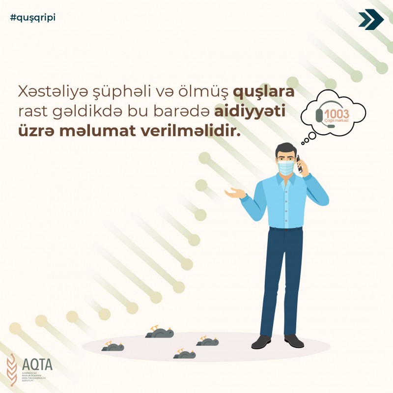 – Ölü halda çöl və ev quşlarına rast gəldikdə bu barədə aidiyyəti üzrə məlumat verilməsi (AQTA-nın 1003-Çağrı Mərkəzi və regional bölmələri, rayon baytarlıq idarələri və s.);