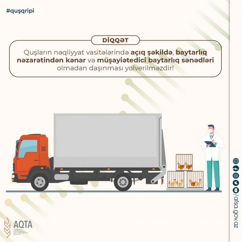 Hazırda dünyanın bir sıra ölkələrində yüksək patogen quş qripi xəstəliyi qeydə alınıb və xəstəliyin yayılma arealı genişlənməkdə davam edir. Bunu nəzərə alaraq Azərbaycan Qida Təhlükəsizliyi Agentliyi qaydalar tərtib edib.
