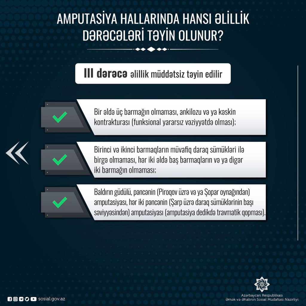 TIME ƏƏSMN-in məlumatına istinadən bildirir ki, Nazirlər Kabinetinin 30 dekabr 2015-ci il tarixli Qərarı ilə təsdiq edilmiş “Əlilliyin və sağlamlıq imkanlarının məhdudluğunun müəyyən olunması meyarlarına dair Əsasnamə”də amputasiya hallarında hansı əlillik dərəcələrinin təyin olunduğu göstərilir.