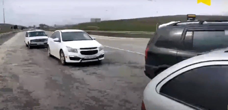 Ərazidə baş verən çovğun nəticəsində yağan qar yolun hərəkət istiqamətinə yığılıb. Bu vəziyyət yolda avtomobillərin hərəkətinin dayanmasına səbəb olub. Artıq təhlükəsizlik tədbirləri üçün yolda hərəkət məhdudlaşdırılıb.