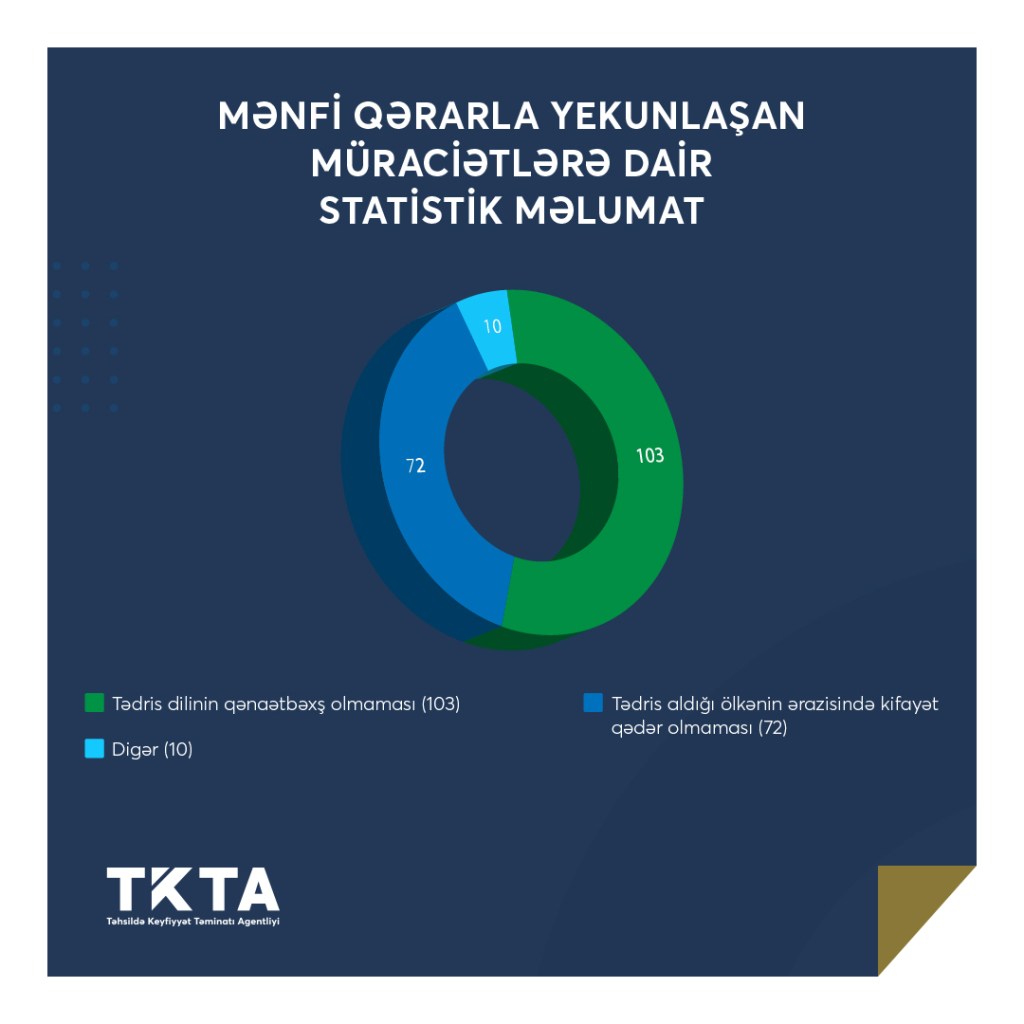 Tədris dili üzrə bilik səviyyəsinin qənaətbəxş olmaması səbəbi ilə 103, tədris yükünü mənimsəmək üçün təhsil aldığı ölkənin ərazisində kifayət qədər olmaması səbəbi ilə 72 və digər səbəblərə görə 10 nəfərin müraciəti mənfi qərarla yekunlaşıb.