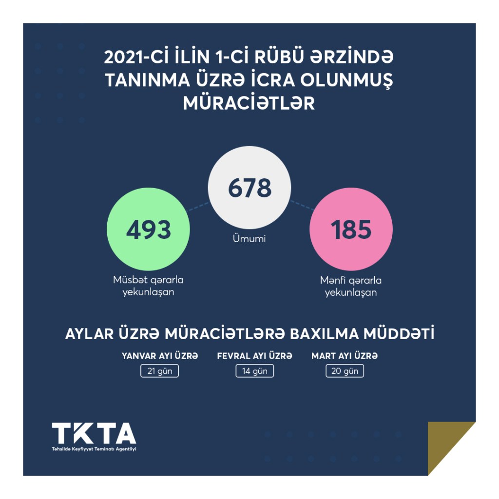 Təhsildə Keyfiyyət Təminatı Agentliyi 2021-ci ilin I rübü ərzində tanınma üzrə müraciətlərin statistikasını açıqlayıb. Belə ki, qeyd edilən dövr ərzində 678 müraciətçinin 493-ü barədə müsbət qərar verilərək müvafiq şəhadətnamələr təqdim edilib, 185 nəfərin müraciəti isə mənfi qərarla yekunlaşıb.
