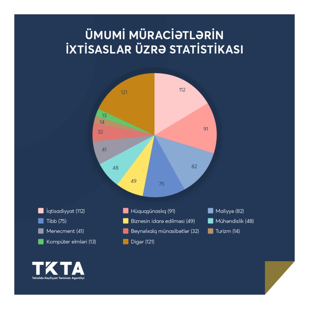 İxtisas seçimlərində iqtisadiyyat üzrə 112, hüquqşünaslıq üzrə 91, maliyyə üzrə 82, tibb üzrə 75, biznesin idarə edilməsi üzrə 49, mühəndislik üzrə 48, menecment üzrə 41, beynəlxalq münasibətlər üzrə 32, turizm üzrə 14, kompüter elmləri üzrə 13 və digər ixtisaslar üzrə 121 nəfər müraciətçi qeydə alınıb.