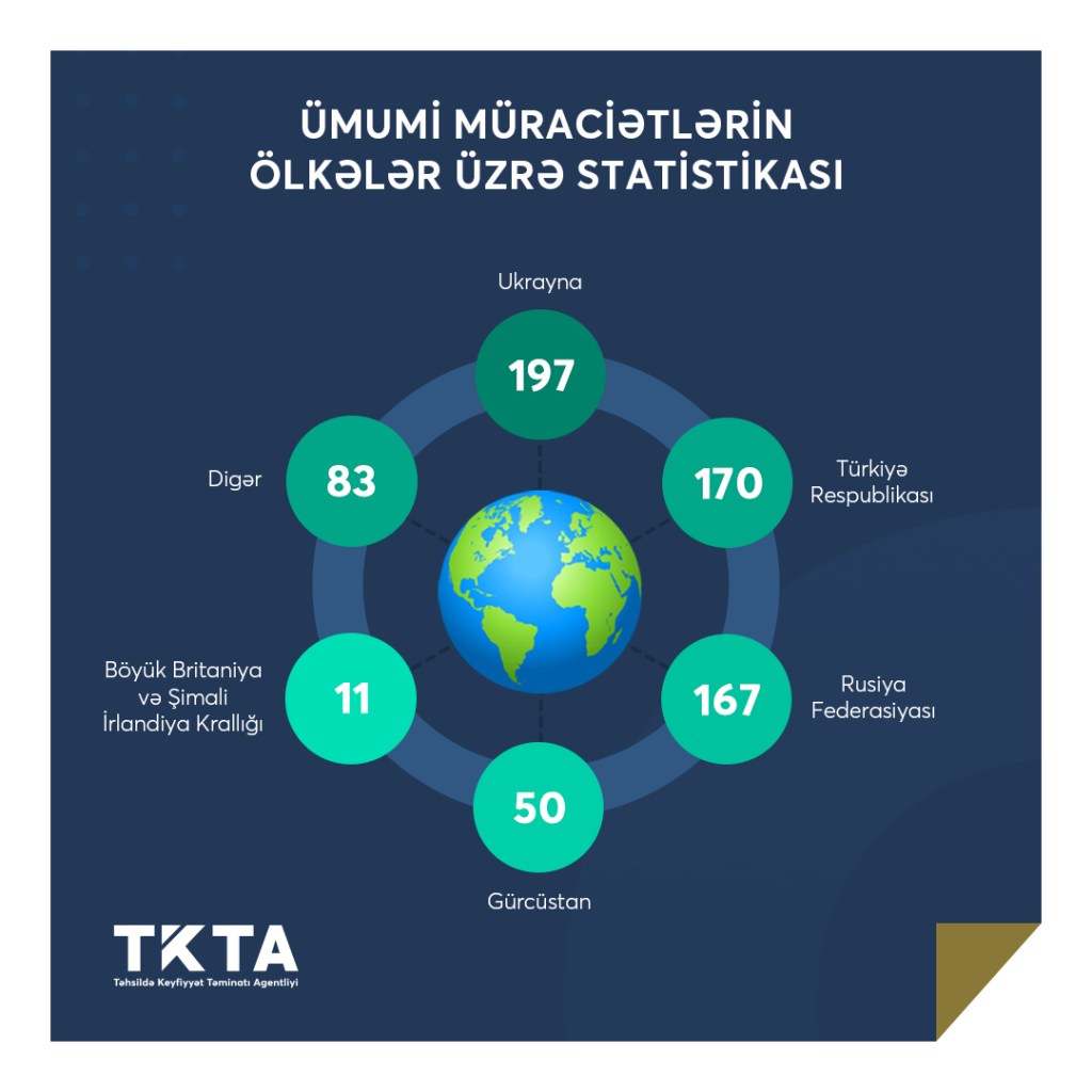 Ölkələr üzrə müraciətlərin sayına nəzər saldıqda Ukraynadan 197, Türkiyədən 170, Rusiyadan 167, Gürcüstandan 50, Böyük Britaniya və Şimali İrlandiya Krallığından 11, digər ölkələrdən isə 83 müraciətin olduğu müşahidə olunur.
