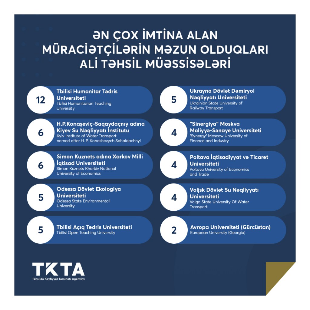 Ümumilikdə rüb ərzində verilən mənfi qərarların 29 faizi aşağıda qeyd edilən 10 ali təhsil müəssisəsini əhatə edir.