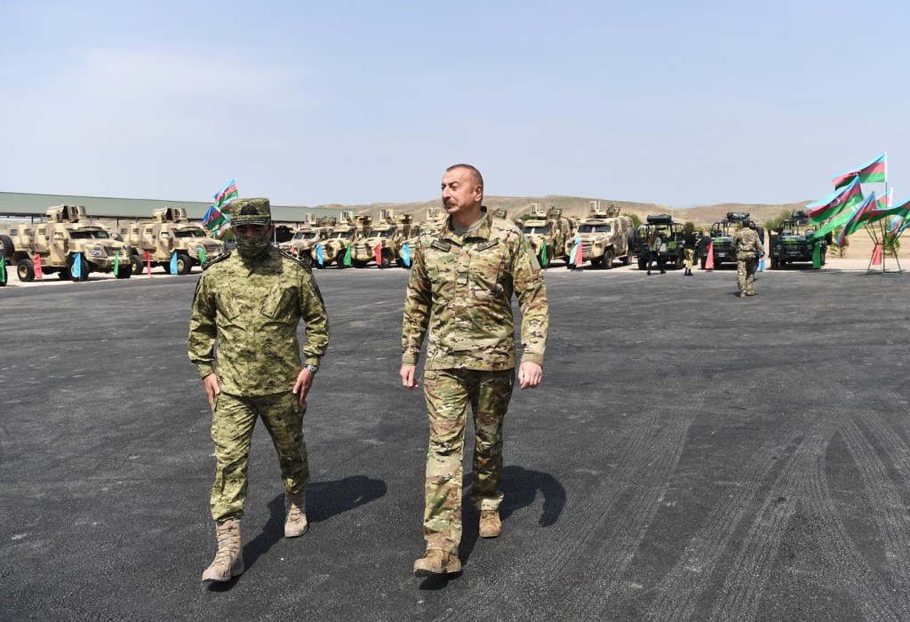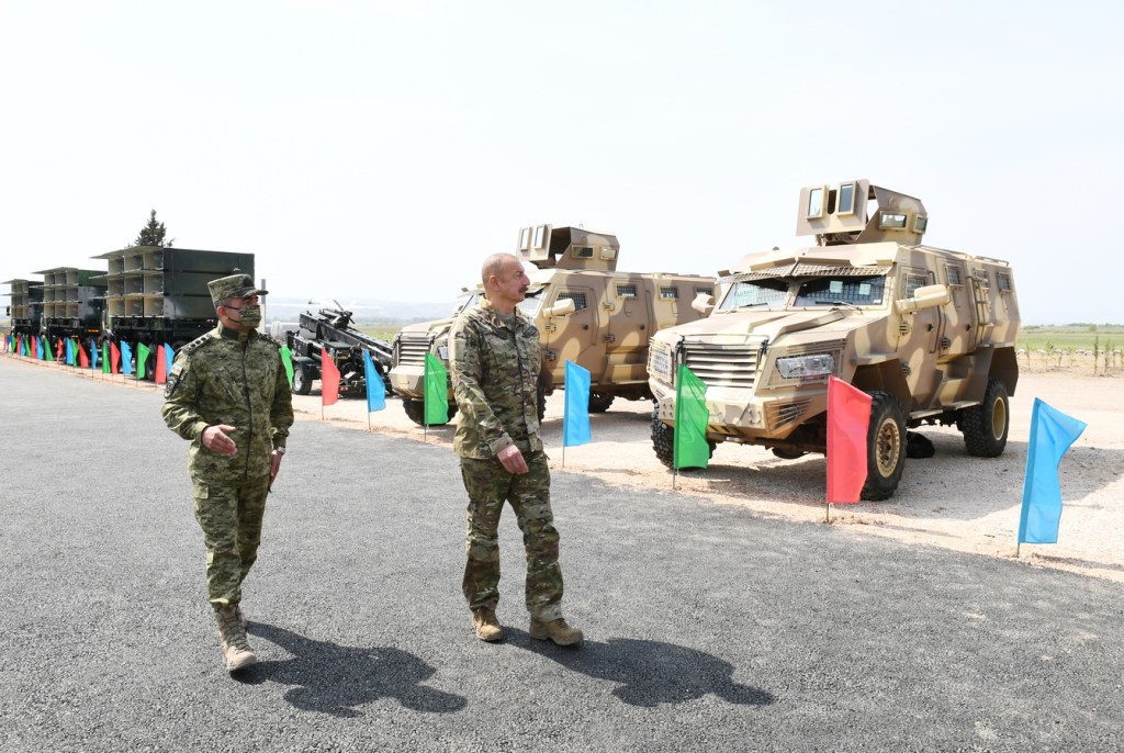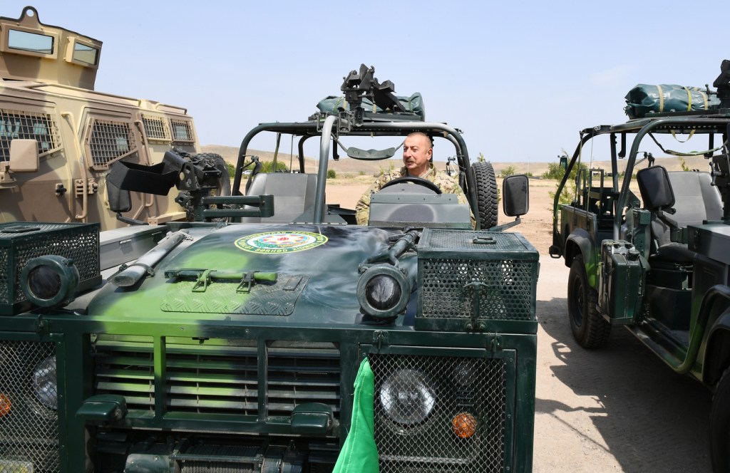 Sonra Prezident İlham Əliyev yeni hərbi maşınlarla tanış oldu və onlardan birini idarə etdi.