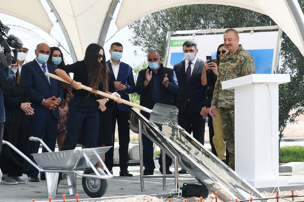 Prezident İlham Əliyev: Çox yaxşı. Deməli, əlbəttə ki, bu, noyabr və ya dekabr ola bilər. Bilirəm ki, planlamaq, təşkil etmək və icra etmək asan deyil, çünki biz bütün infrastrukturu, 200-dən çox evi olan kəndi, qəsəbəni salmalıyıq. Çünki buraya yaşamağa gələn insanların iş yerlərinə və istehsalata ehtiyacı olacaq. Mən burada şəkillərə baxıram, onlar çox yaxşı görünür. Məşhur “motsarella” pendiri.