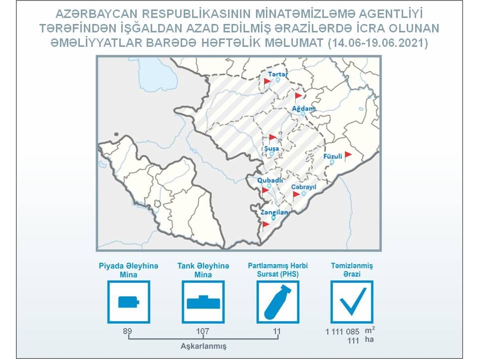 Trend-in verdiyi məlumata əsasən, iyunun 14-dən 19-dək Tərtər, Ağdam, Füzuli, Şuşa, Qubadlı, Cəbrayıl və Zəngilanda aparılan əməliyyat-axtarış tədbirləri zamanı piyada əleyhinə 89, tank əleyhinə 107 mina və 11 partlamamış hərbi sursat aşkarlanaraq zərərsizləşdirilib.