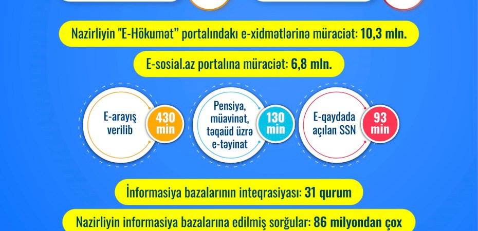 TIME rəsmi mənbəyə istinadən bildirir ki, Əmək və Əhalinin Sosial Müdafiəsi Nazirliyinin “Elektron Hökumət” portalına yerləşdirilmiş xidmətlərinə bu ilin 8 ayında 10,3 milyon, e-sosial.az portalına isə 6 milyon 850 minə yaxın müraciət qeydə alınıb. Bu dövrdə sosial təminat növləri (pensiya, müavinət, təqaüd) üzrə 130 minə yaxın təyinat və 93 minədək işçiyə sosial sığorta nömrəsinin (SSN) açılması e-qaydada, proaktiv formada yerinə yetirilib. Vətəndaşlara Nazirliyin fəaliyyət sahələri üzrə bu ilin 8 ayında e-qaydada 430 minə yaxın arayış verilib.