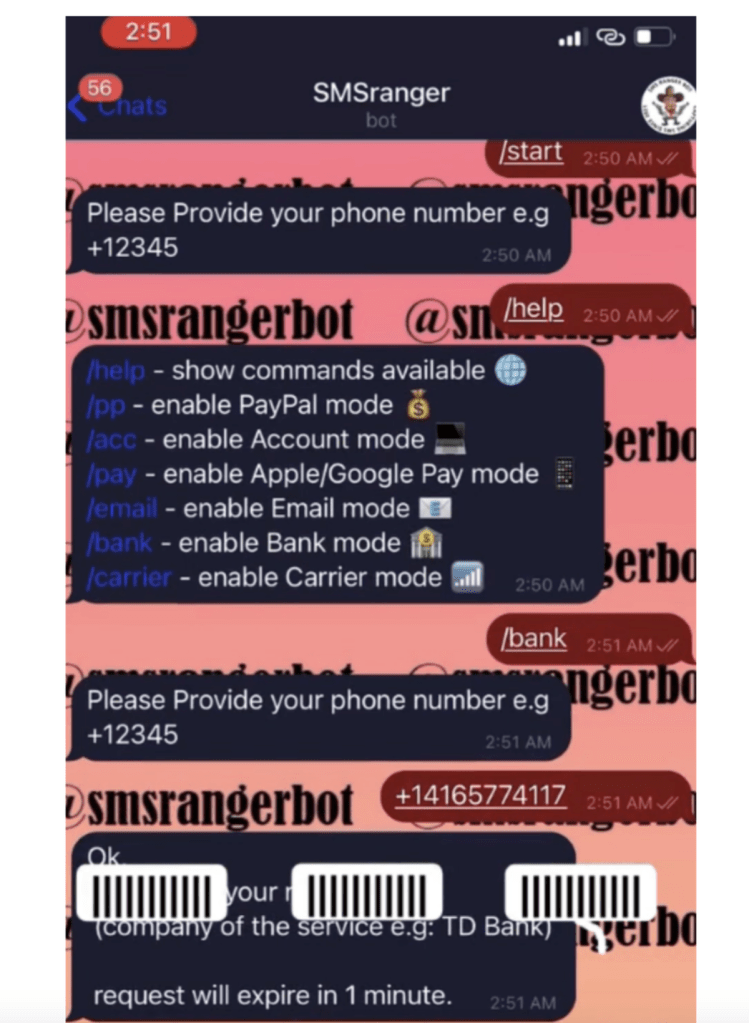 Ziyanverici botların vəzifəsi birdəfəlik şifrələrin ələ keçirilməsi məqsədilə qurbanlara bankların adından avtomatik şəkildə zəng olunması və ya mətn mesajlarının göndərilməsidir. Belə botu yaratmaq üçün cinayətkarlar əsas proqramlaşdırma bacarıqlarına malik olmalıdır. Tədqiqatçılar SMSRanger və BloodOTPbot kimi botları misal çəkir. Birinci botun interfeysi Slack-a bənzəyir, ikincisi isə daha çox SMS-mesajları ilə işləyir.