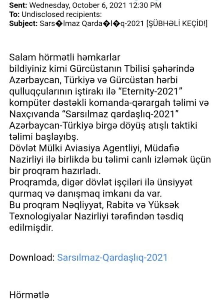 TIME rəsmi mənbəyə istinadən bildirir ki, vətəndaşlara elektron poçt üzərindən göndərilən saxta məktublarda guya Azərbaycan, Türkiyə və Gürcüstan hərbi qulluqçularının iştirakı ilə müxtəlif hərbi təlimlərin keçirildiyi bildirilir. Qeyd olunur ki, həmin təlimləri canlı izləmək üçün Dövlət Mülki Aviasiya Agentliyi Müdafiə Nazirliyi ilə birlikdə “Sarsılmaz qardaşlıq – 2021” proqramını hazırlayıb. Saxta məktubda həmin proqramın Nəqliyyat, Rabitə və Yüksək Texnologiyalar Nazirliyi tərəfindən təsdiq edildiyi vurğulanır.