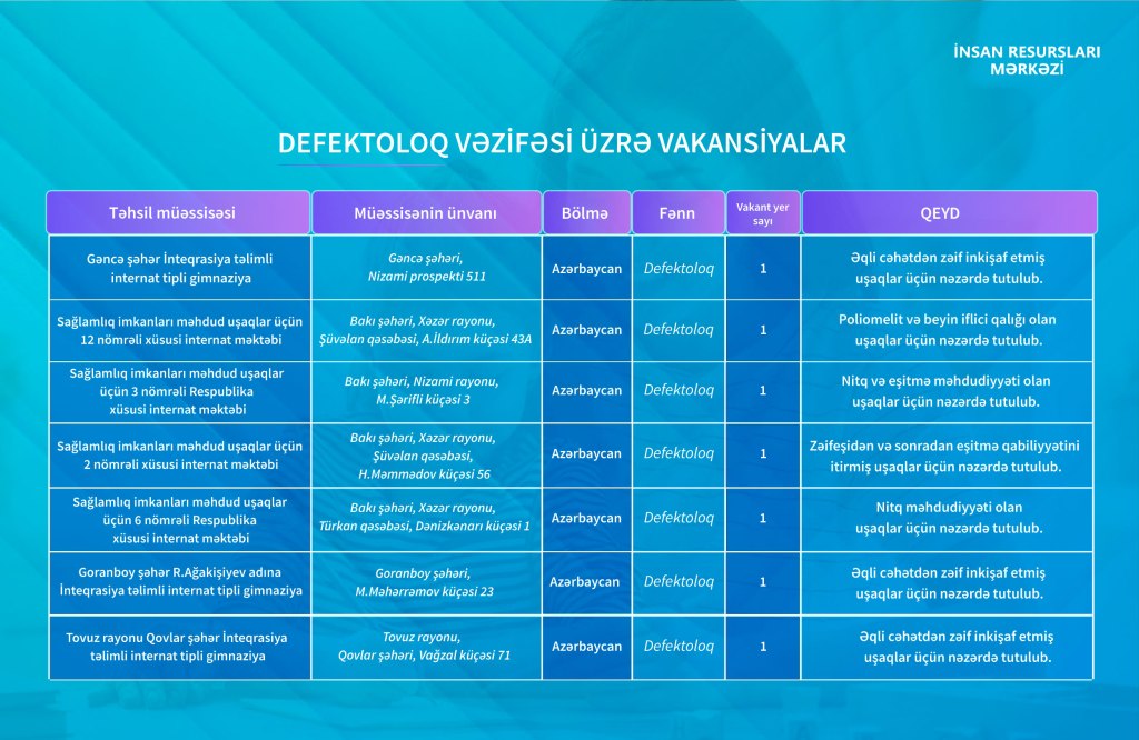 Xüsusi təhsil müəssisələrinə defektoloq vəzifəsi üzrə işə qəbul üçün vakansiya seçiminə start verilir.