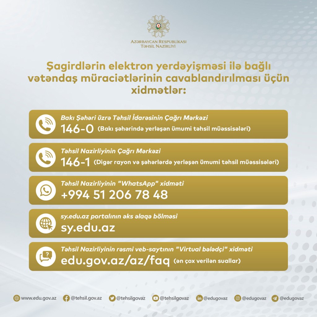 Təhsil Nazirliyi şagird yerdəyişməsi prosesinin həyata keçirilməsi ilə bağlı vətəndaş müraciətlərinin cavablandırılması məqsədilə aşağıdakı xidmətləri təqdim edir: