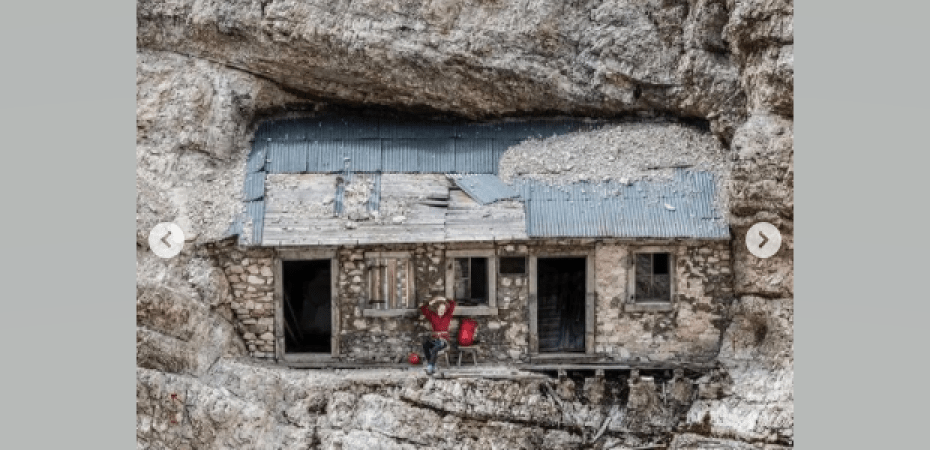 Как пишут зарубежные СМИ, в Доломитовых Альпах в Италии в отвесной скале в массиве Монте-Кристалло на высоте более 2700 метров над уровнем моря спрятан небольшой домик с тремя окнами и двумя дверями.