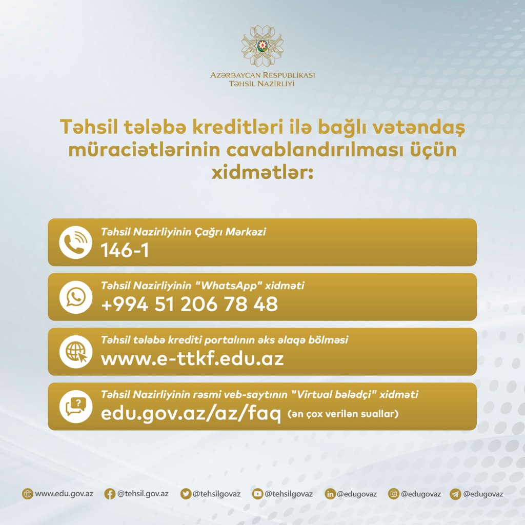 TIME rəsmi mənbəyə istinadən bildirir ki, aşağıda qeyd edilən Çağrı mərkəzi və WhatsApp nömrələrinə, həmçinin təhsil tələbə krediti portalına və Təhsil Nazirliyinin rəsmi internet səhifəsinin müvafiq bölməsinə müraciət edərək təhsil tələbə krediti ilə bağlı istənilən məlumatı əldə etmək olar.