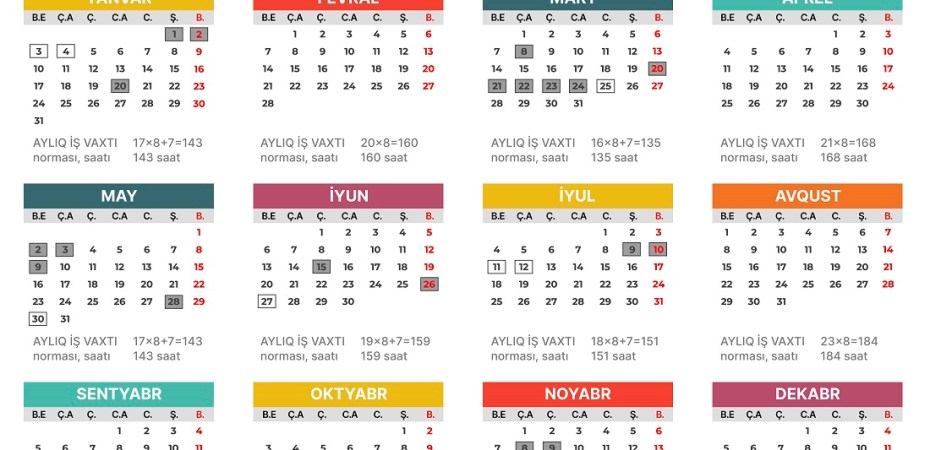2022-ci il üçün iş vaxtı normasında bildirilir ki, Azərbaycan Respublikasının Əmək Məcəlləsinə və Azərbaycan Respublikası Nazirlər Kabinetinin “2022-ci il üçün Novruz, Ramazan və Qurban bayramları günlərinin müəyyən edilməsi haqqında” 2021-ci il 1 dekabr tarixli 375 nömrəli Qərarına əsasən 2022-ci ildə aşağıdakı günlər iş günü hesab edilmir: