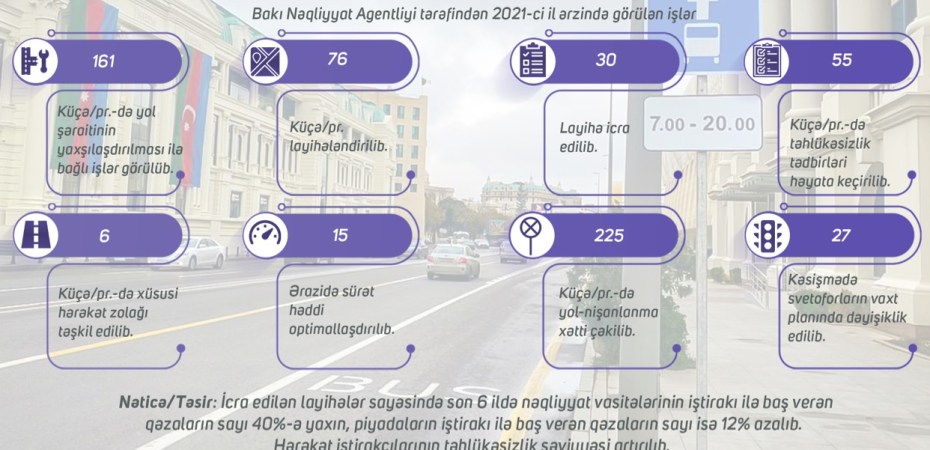Ümumilikdə, son 6 ildə Bakı Nəqliyyat Agentliyinin yol hərəkəti təhlükəsizliyi sahəsində həyata keçirdiyi tədbirlər nəticəsində nəqliyyat vasitələrinin iştirakı ilə baş verən yol qəzalarının dinamikasında azalma müşahidə edilir. Belə ki, avtomobil qəzalarının sayı 40%, piyadaların iştirakı ilə baş verən qəzaların sayı isə 12% azalıb.
