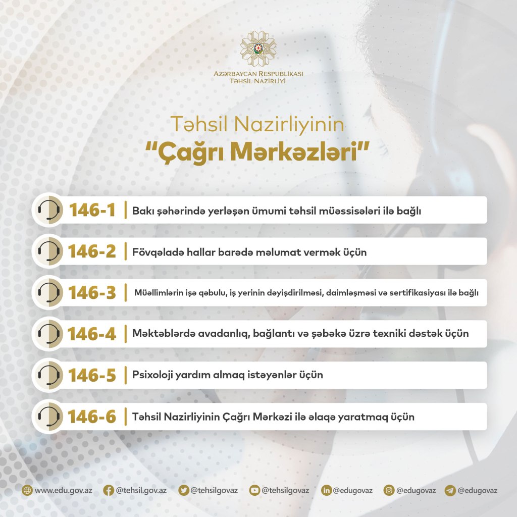 Belə ki, bundan sonra yaranan suallarınızın aid olduğu istiqamət üzrə nazirliyin Çağrı Mərkəzlərinin aşağıdakı nömrələri ilə əlaqə yarada bilərsiniz.