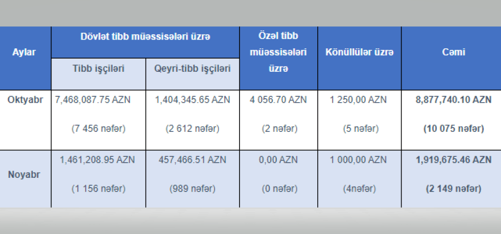 Tibb və qeyri-tibb tibb işçilərinə, eləcə də könüllülərə qeyd edilən aylar üzrə ödənilən müddətli əlavə və mükafatların məbləği aşağıdakı kimidir: