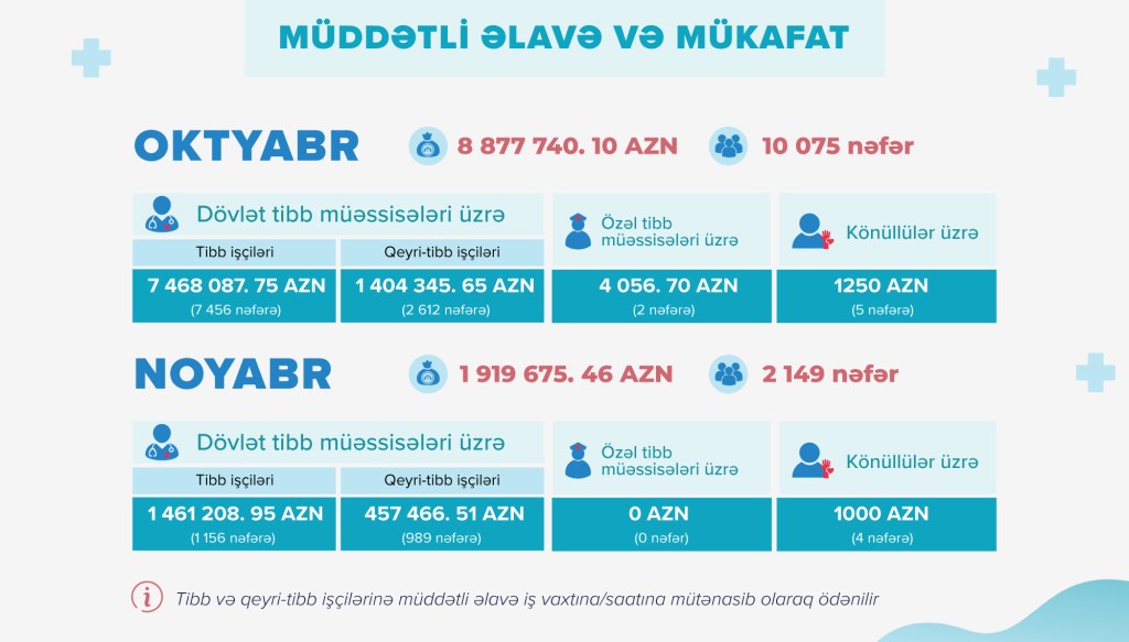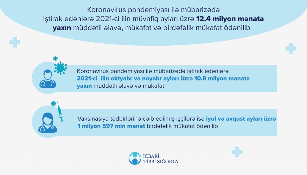 TIME rəsmi mənbəyə istinadən bildirir ki, Azərbaycan Respublikası Prezidentinin müvafiq sərəncamına və Nazirlər Kabinetinin müvafiq qərar və sərəncamlarına uyğun olaraq İcbari Tibbi Sığorta üzrə Dövlət Agentliyi (Agentlik) tərəfindən 2021-ci ilin oktyabr və noyabr ayları ərzində yeni növ koronavirus infeksiyası ilə mübarizə tədbirlərində iştirak edən tibb işçilərinə iş vaxtına/saatına mütənasib olaraq təxminən 8.9 milyon manatdan çox, qeyri-tibb işçilərinə isə 1.9 milyon manata yaxın müddətli əlavə ödənilib.