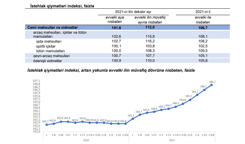 TIME Dövlət Statistika Komitəsinin məlumatına istinadən bildirir ki, 2021-ci ildə istehlak qiymətləri indeksi 2020-ci ilə nisbətən 106,7 faiz, o cümlədən ərzaq məhsulları, içkilər və tütün məmulatları üzrə 108,1 faiz, qeyri-ərzaq məhsulları üzrə 105,1 faiz, əhaliyə göstərilmiş ödənişli xidmətlər üzrə 105,8 faiz təşkil edib.