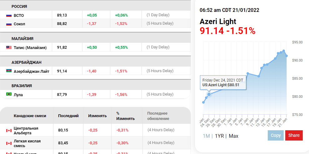 Yanvarın 21-ə olan məlumata əsasən Azeri Light markalı neftin qiyməti hazırda 91,14 dollar təşkil edir. Dekabr ayı ilə müqayisədə Azeri Light-ın qiyməti 14% artıb.