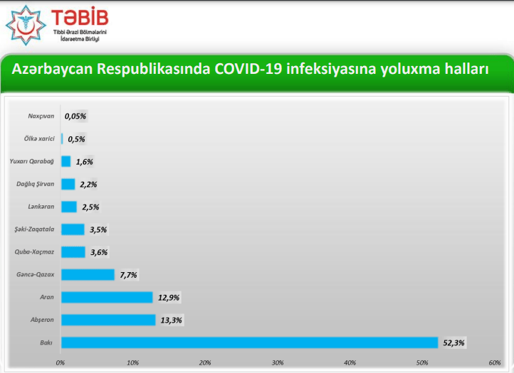 Azərbaycan üzrə COVID-19 infeksiyasına yoluxma halları ən çox Bakıda (52,3%), Abşeronda (13,3%), Aranda (12,9%), Gəncə-Qazax zonasında (7,7%) müşahidə olunur.