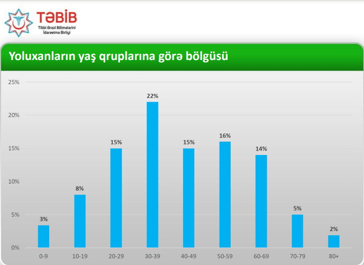 Yoluxanların yaş qruplarına görə bölgüsü göstərir ki, hazırda yoluxma sayı daha çox (22%) 30-39 yaş hədində olan insanlar arasında müşahidə olunur. Yoluxanların 16% 50-59 yaşda olanlar, 15% 20-29 yaşında , 15% 40-49 yaşında, 14% isə 60-69 yaşında olanlardır. Azyaşlı uşaqlar, yeniyetmələr və gənclər arasında yoluxma səviyyəsi 3-8% təşkil edir. Ahıl insanlar arasında yoluxma səviyyəsi 2-5% ötmür.