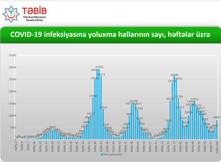 Tibbi Ərazi Bölmələrini İdarəetmə Birliyi (TƏBİB) Azərbaycanda COVID-19 virusuna yoluxma və vaksinasiya səviyyəsi ilə bağlı ətraflı statistika təqdim edib. Son bir həftə ərzində yoluxma sayı 2 dəfəyədək artıb.