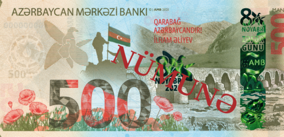 TIME rəsmi mənbəyə istinadən bildirir ki, 500 manat nominallı pul nişanı Azərbaycan Respublikası Silahlı Qüvvələrinin Ali Baş Komandanı, Möhtərəm Prezident İlham Əliyevin rəhbərliyi ilə Qarabağın azadlığı uğrunda 2020-ci ildə aparılmış 44 günlük Vətən müharibəsində Azərbaycan ordusunun tarixi zəfəri münasibəti ilə Azərbaycan Mərkəzi Bankı tərəfindən 04 noyabr 2021-ci il tarixində tədavülə buraxılıb.