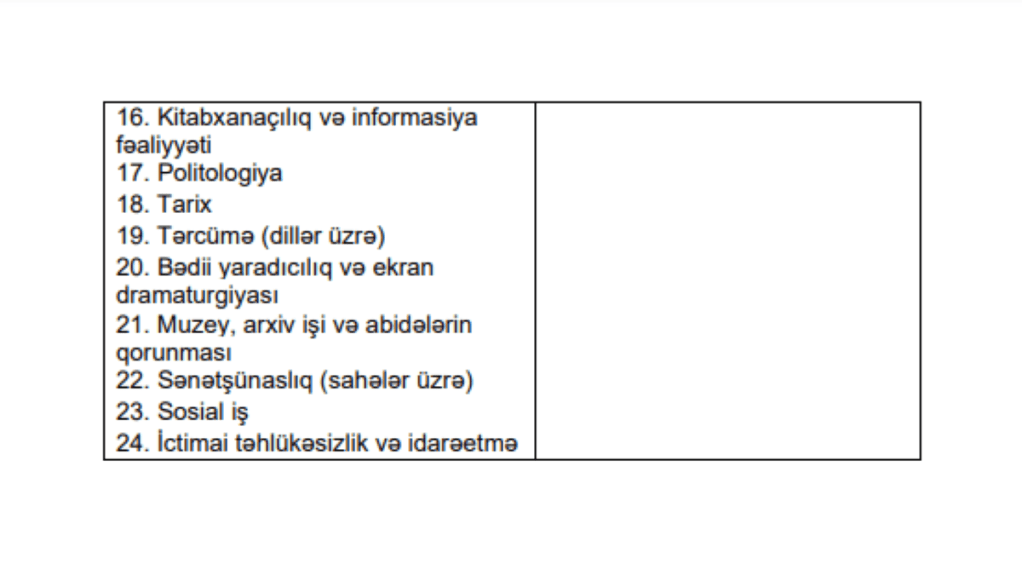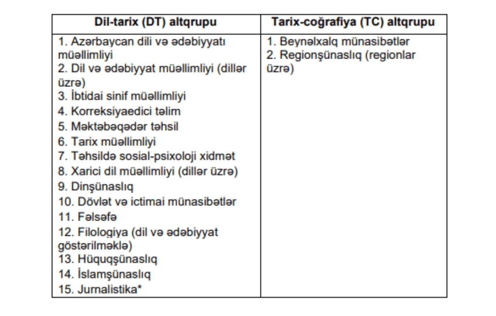 Qaydalara 1 nömrəli əlavə – “İxtisas qrupları və ixtisaslar”ın III ixtisas qrupu sütunu “İxtisasların adı” sətrindən sonra “Dil-tarix (DT) altqrupu” və “Tarix-coğrafiya (TC) altqrupu” adlı iki sütuna bölünməklə aşağıdakı redaksiyada verilir: