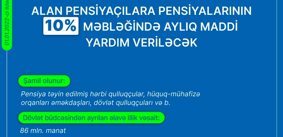 Sərəncamla Əmək və Əhalinin Sosial Müdafiəsi Nazirliyi 2022-ci il yanvarın 1-dək pensiya təyin edilmiş qulluq stajına görə əlavələr alan əmək pensiyaçılarına 2022-ci ildə aylıq pensiya məbləğlərinin (qulluq stajına görə əlavələr də nəzərə alınmaqla) 10 faizi məbləğində aylıq maddi yardım ödəyəcək.