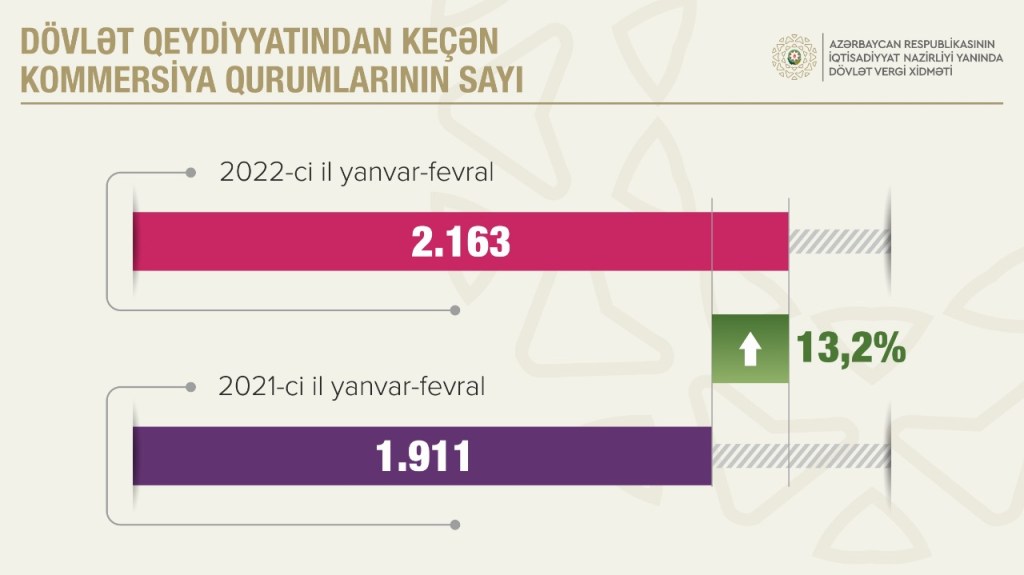 Yanvar-fevral aylarında fəaliyyəti aktivləşmiş (bərpa edilmiş) hüquqi şəxslərin sayı əvvəlki ilin müvafiq dövrü ilə müqayisədə 25,4%, fəaliyyəti aktivləşmiş ƏDV ödəyicilərinin sayı 29,5% artıb. Martın 1-nə dövlət qeydiyyatında olan 147.874 kommersiya qurumundan 89.128-nin vəziyyəti aktiv olub. 2021-ci ilin müvafiq dövrü ilə müqayisədə aktiv kommersiya qurumlarının sayı 12,2% artıb, xüsusi çəkisi isə artaraq 60,3%-ə çatıb.