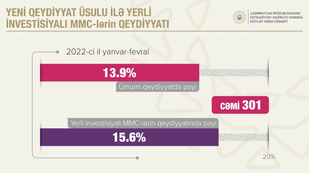 Yanvar və fevral aylarında yerli investisiyalı məhdud məsuliyyətli cəmiyyətlərin e-qeydiyyatının xüsusi çəkisi 95,3% təşkil edib. Yeni qeydiyyat üsulu ilə (fin kod+mobil nömrə) 301 yerli investisiyalı məhdud məsuliyyətli cəmiyyət qeydiyyata alınıb. Bu üsulun ümumi qeydiyyatda xüsusi çəkisi 13,9%, yerli investisiyalı məhdud məsuliyyətli cəmiyyətlərin qeydiyyatında isə 15,6% təşkil edib.
