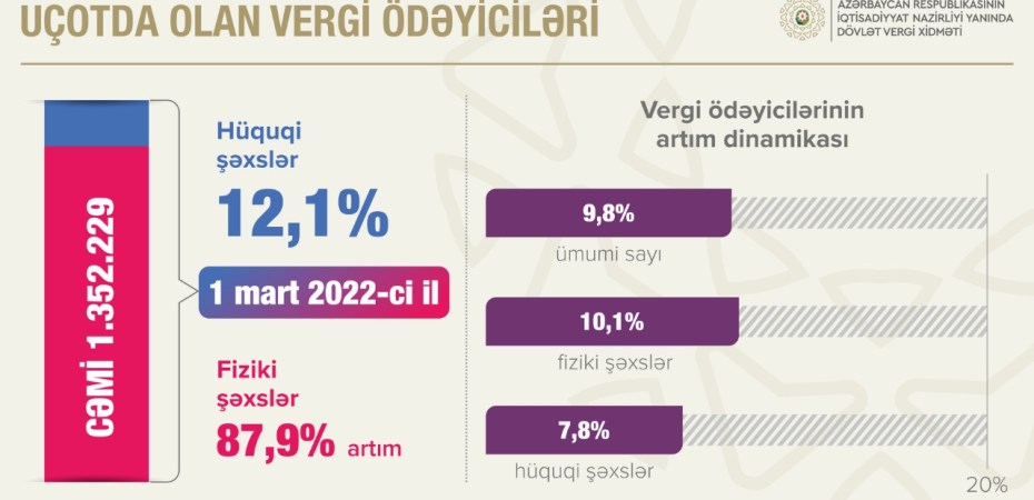TIME rəsmi mənbəyə istinadən bildirir ki, 2020-ci ilin müvafiq dövrü ilə müqayisədə vergi ödəyicilərinin ümumi sayı 9,8%, o cümlədən fiziki şəxslərin sayı 10,1%, hüquqi şəxslərin sayı isə 7,8% artıb.